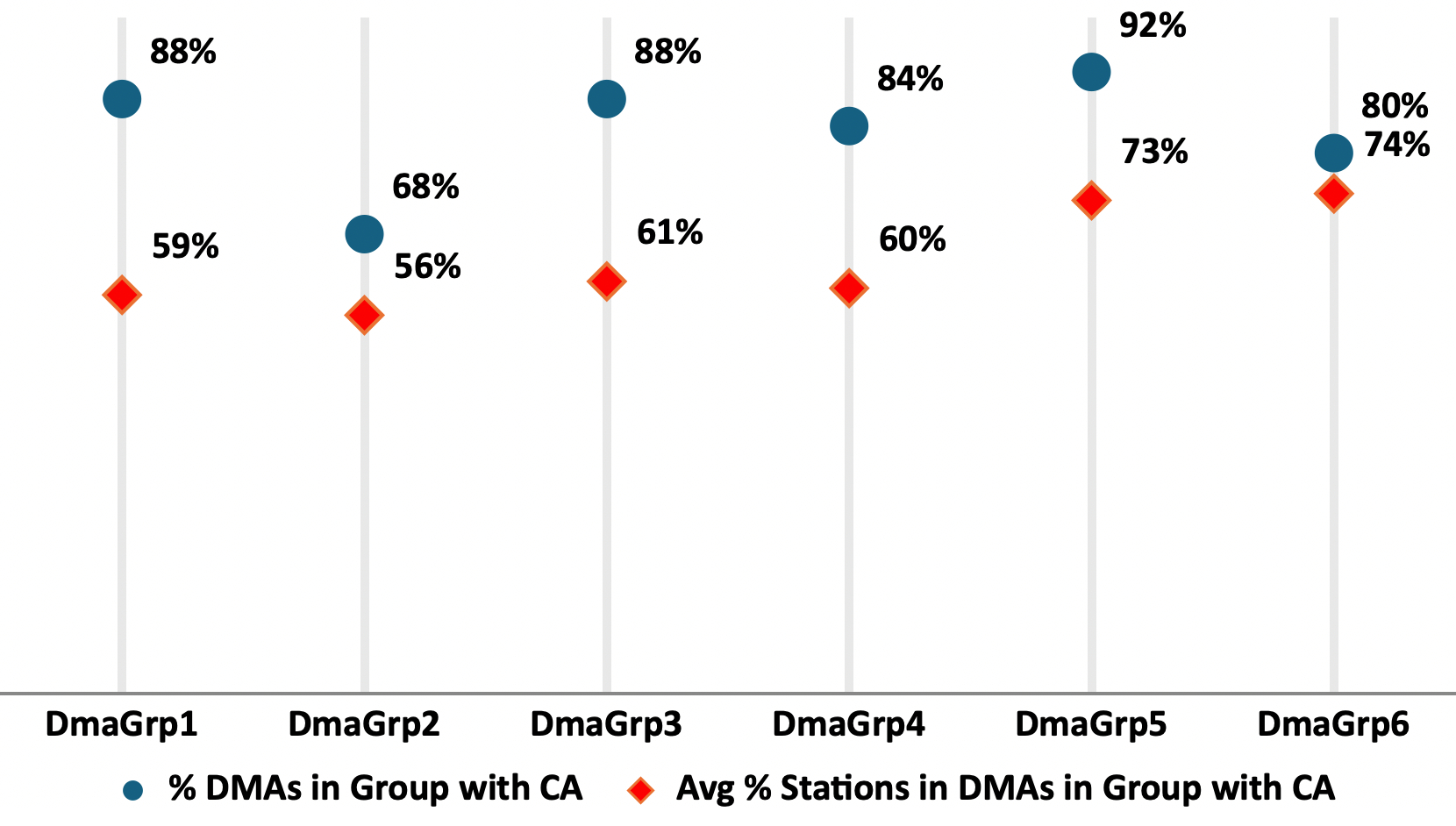 DMA Groups 5 and 6 were considerably larger than the first four DMA Groups, with 50 and 60 markets, respectively. DMA Group 5 accounted for more than one-fifth of stations (n=189, 22%).